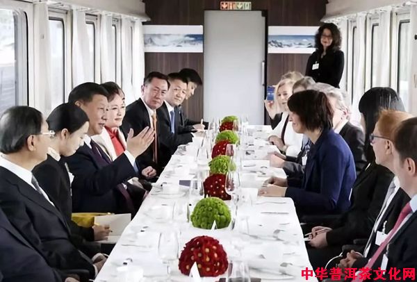 從蘇黎世到伯爾尼列車行程約為1小時。在行駛的專列上,習(xí)主席和夫人彭麗媛受洛伊特哈德主席夫婦邀請,在輕松愉快的氛圍中品茶暢談。從照片來看,中瑞雙方十多人出席,氣氛相當(dāng)輕松。